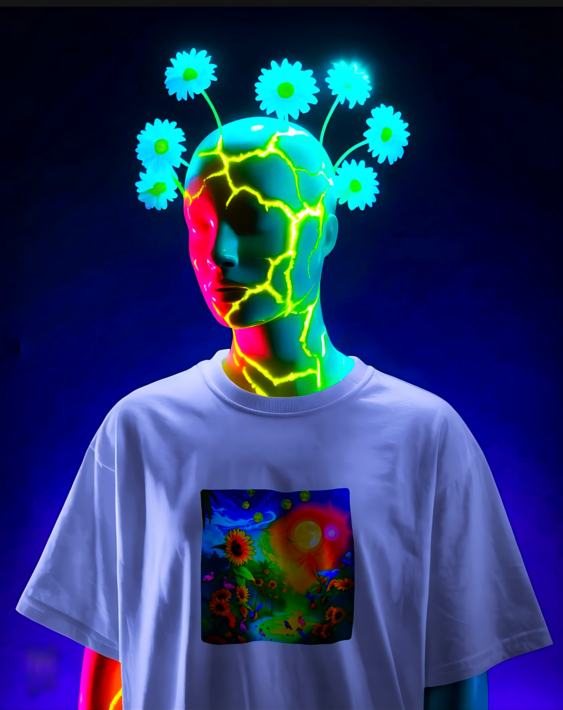 <span;>Paysage vibrant et surréaliste avec des tournesols, des flamants roses, des oiseaux colorés, un soleil brillant et des orbes célestes. Des couleurs lumineuses et oniriques créent un paradis tropical féérique, plein de joie et de merveille.</span;>